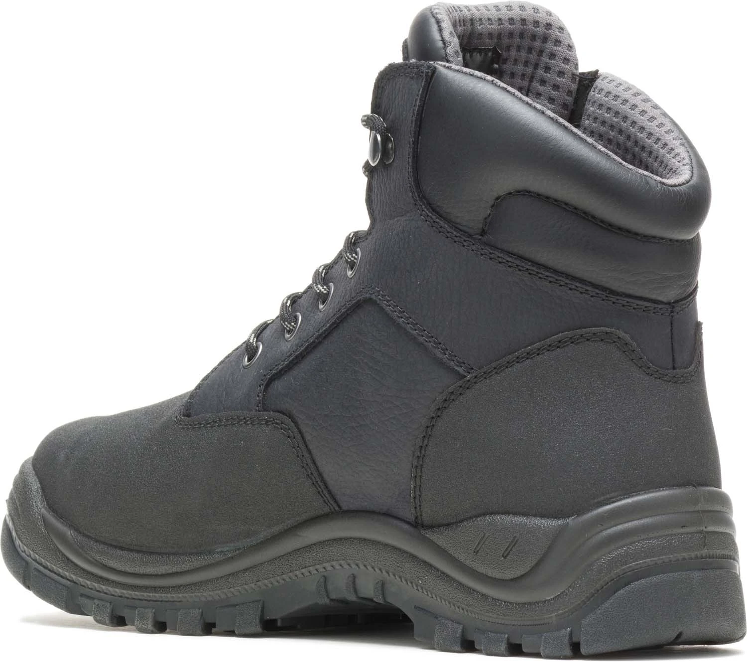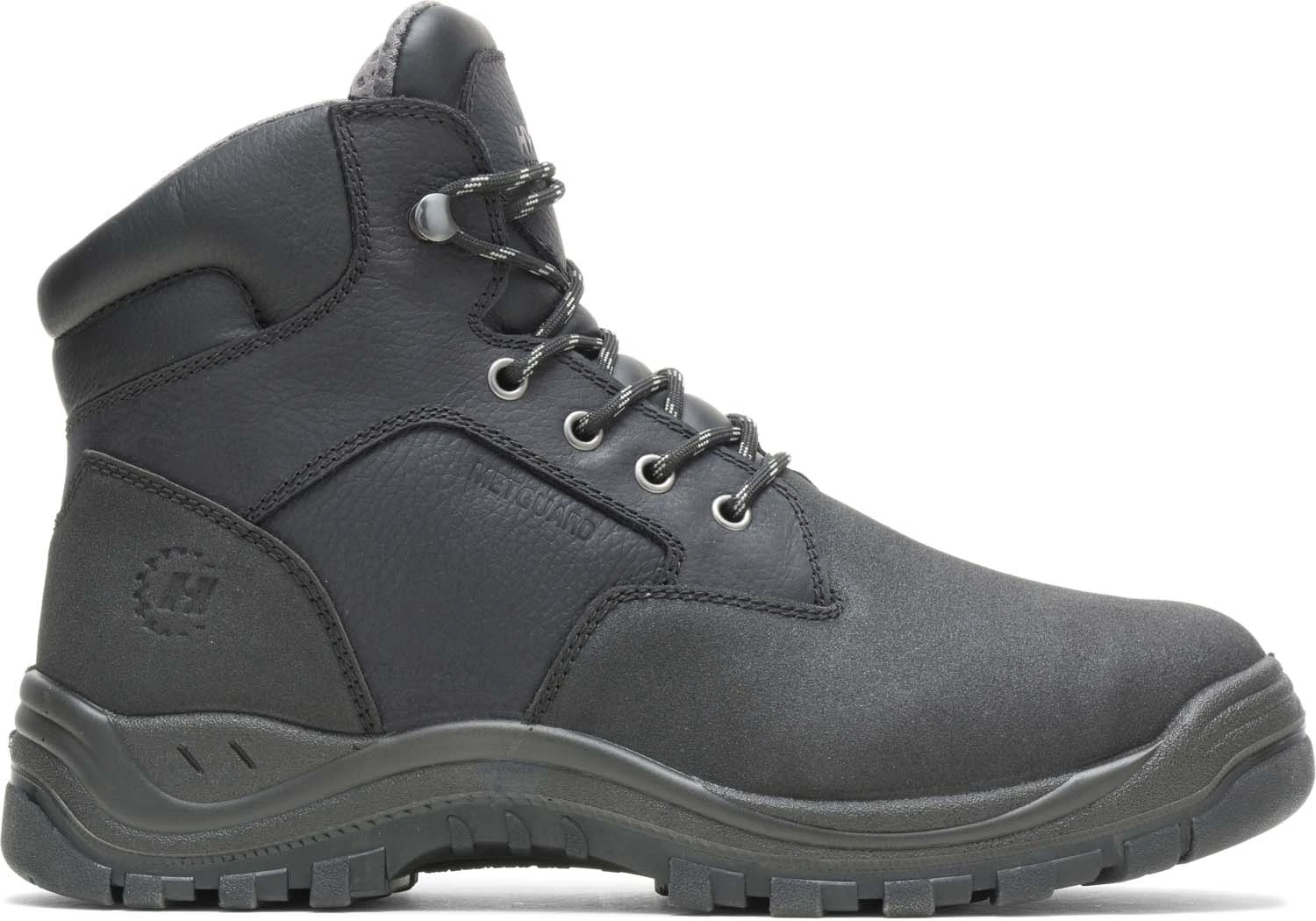 Full grain and Tec-Tuff leather upper. Moisture wicking mesh lining. Removable cushion footbed. PU cushion midsole. Oil and slip resistant TPU outsole. Direct attached construction. Steel toe. EH. Internal met guard. ASTM F2413-18 M/ I/ C EH Mt compliant.