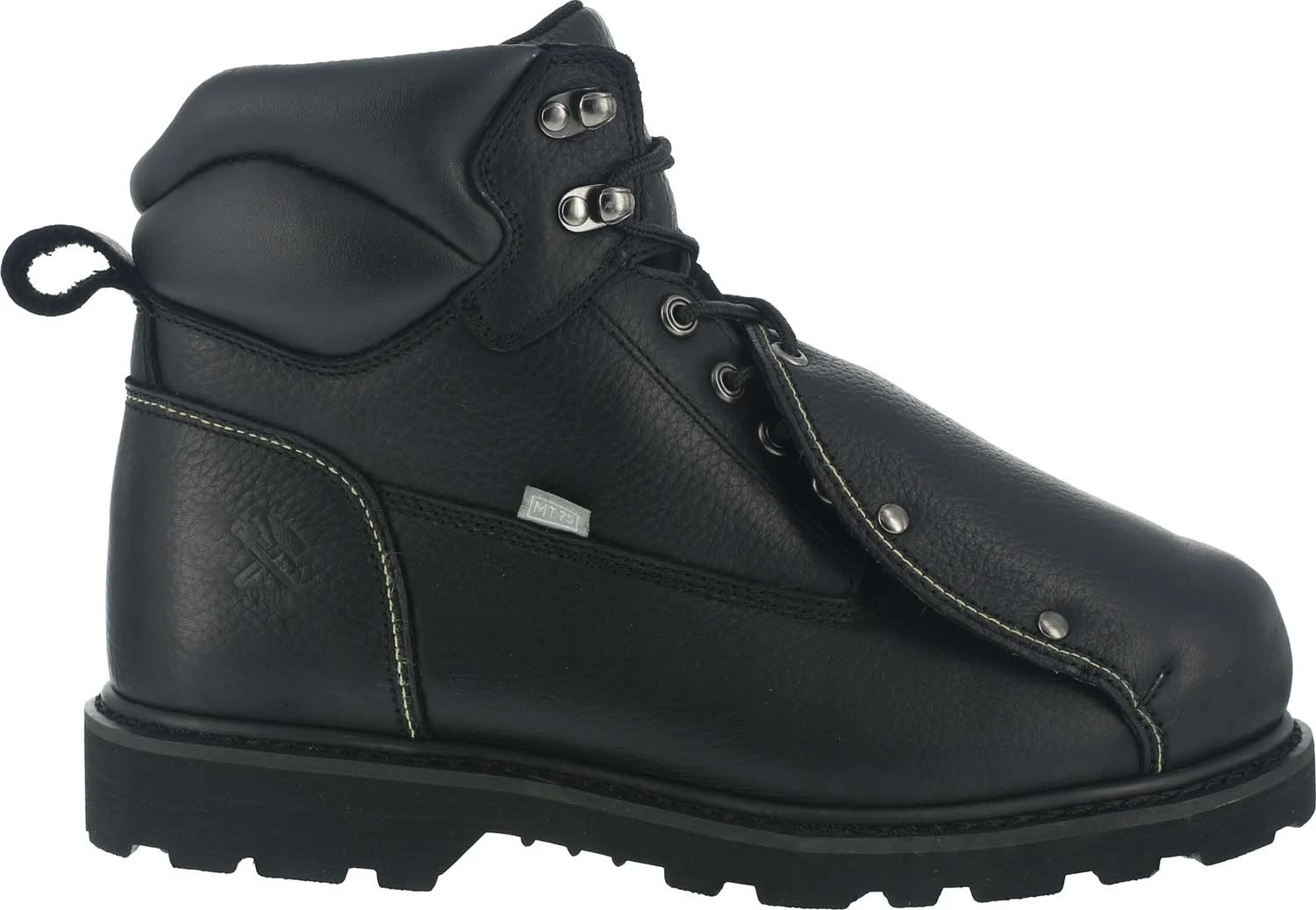 Full grain leather upper. External leather covered met guard. Moisture wicking nylon mesh lining. Removable EVA footbed with sponge rubber heel wedge. Oil, slip and chemical resistant, solid rubber outsole.Goodyear welt construction. Kevlar stitching. Steel toe. EH. Mt. ASTM F2413-18 M/ I/ C EH Mt compliant.