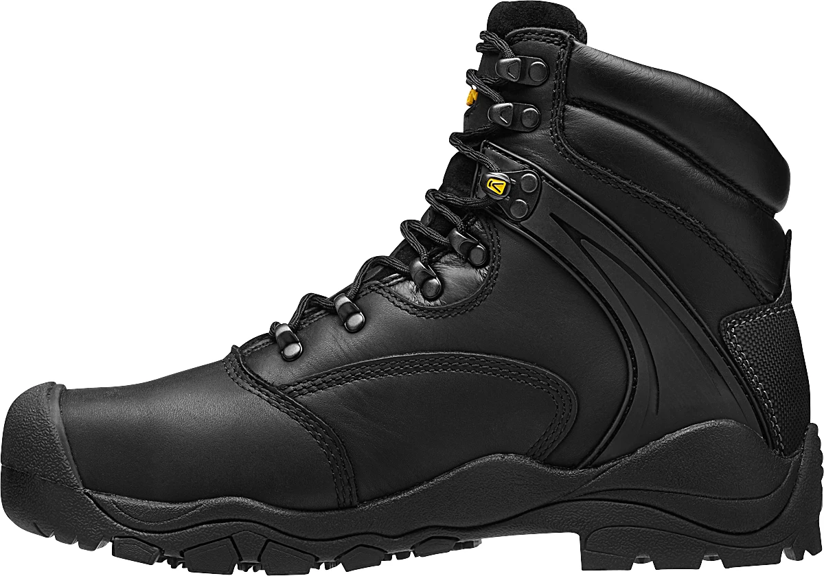 Abrasion resistant tough-tec leather upper. KEEN.DRY waterproof, breathable membrane lining. Removable metatomical dual density EVA footbed. Compression molded EVA midsole. Oil and slip resistant rubber outsole. Waterproof. Steel toe. EH. ASTM F2413-18 M/ I/ C EH compliant.