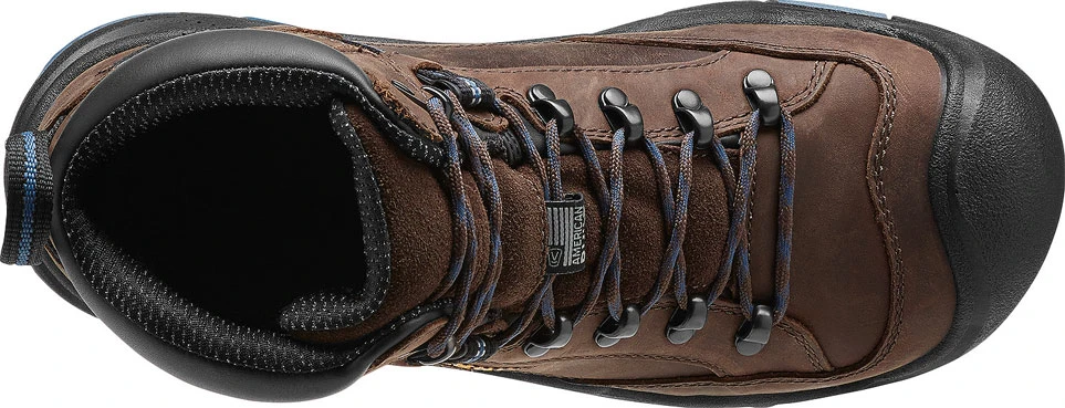 Waterproof nubuck upper leather. Hydrophobic/hydrophilic, 2 zone comfort lining with KEEN.Dry waterproof, breathable membrane. Removable, metatomical, dual density EVA footbed. Direct attached PU midsole with overlay toe bumper.Nonmarking, oil and slip resistant rubber outsole. Assembled in USA. Steel toe. EH. Waterproof. ASTM F2413-18 M/ I/ C EH compliant.
