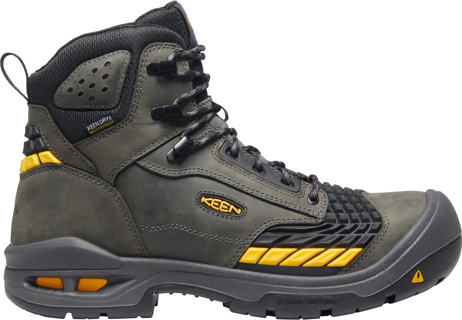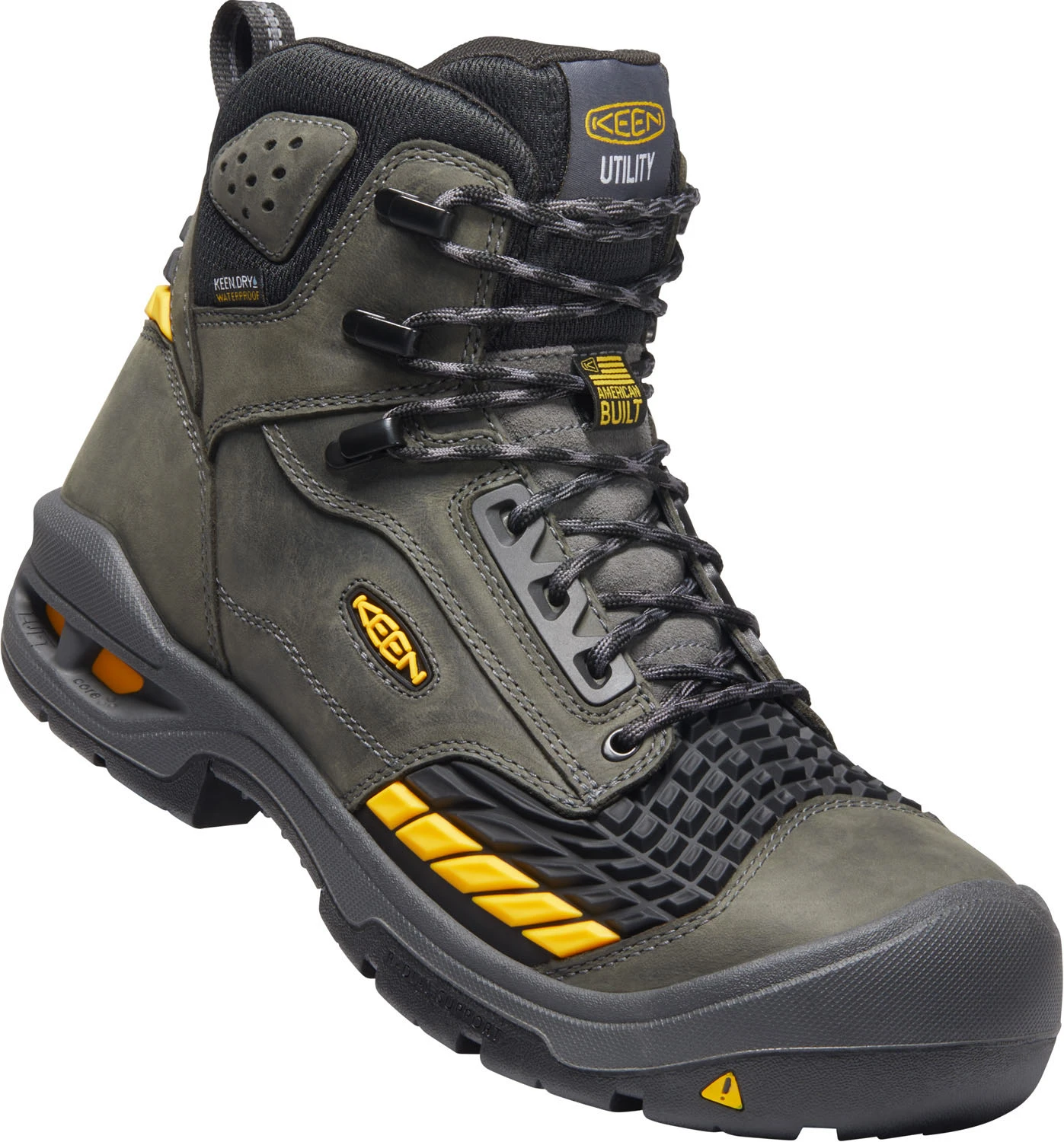 Leather upper. KEEN.BELLOWS FLEX for added forepart flex. Moisture wicking textile lining with KEEN.DRY waterproof, breathable membrane. Removable dual density PolyAer PU footbed. KEEN Luftcell air infused PU midsole. Oil and slip resistant rubber outsole with LuftCore shock absorbing heel. 90 degree heel breast. Heat resistant to 572 degrees F. Carbon fiber safety toe. EH. WP. ASTM F2413-18 M/ I/ C EH compliant.