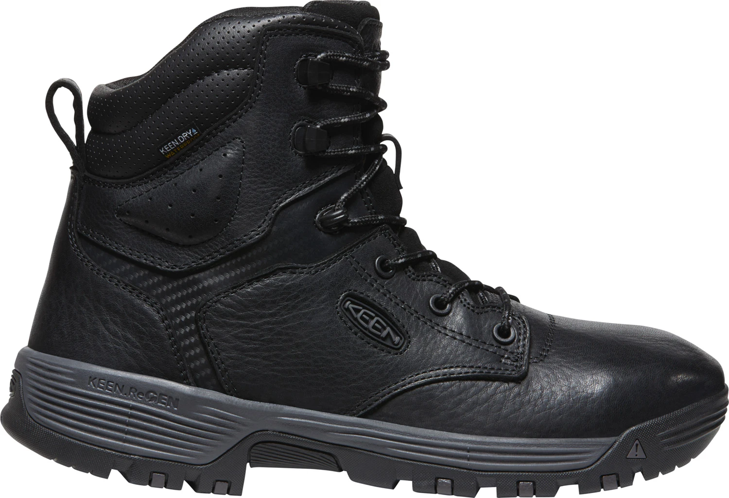 Waterproof leather upper. Mesh and moisture wicking textile lining with KEEN.DRY waterproof, breathable membrane. Removable metatomical PU cushion footbed. KEEN.ReGEN compression resisting midsole. Nonmarking, oil and slip resistant rubber outsole with 90 degree heel breast. Outsole is heat resistant to 572 degrees F. 100% nonmetallic. ASTM EH compliant. WP. Soft toe. No safety toe cap.