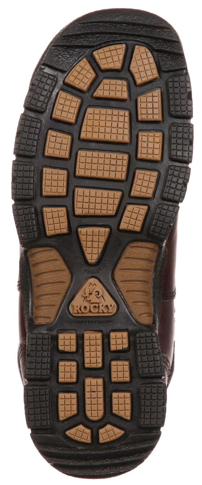 Leather upper. Rocky waterproof construction. Removable PU footbed. EVA cushion midsole. Oil and slip resistant rubber outsole. Steel toe. EH. ASTM F2413-18 M/ I/ C EH compliant.