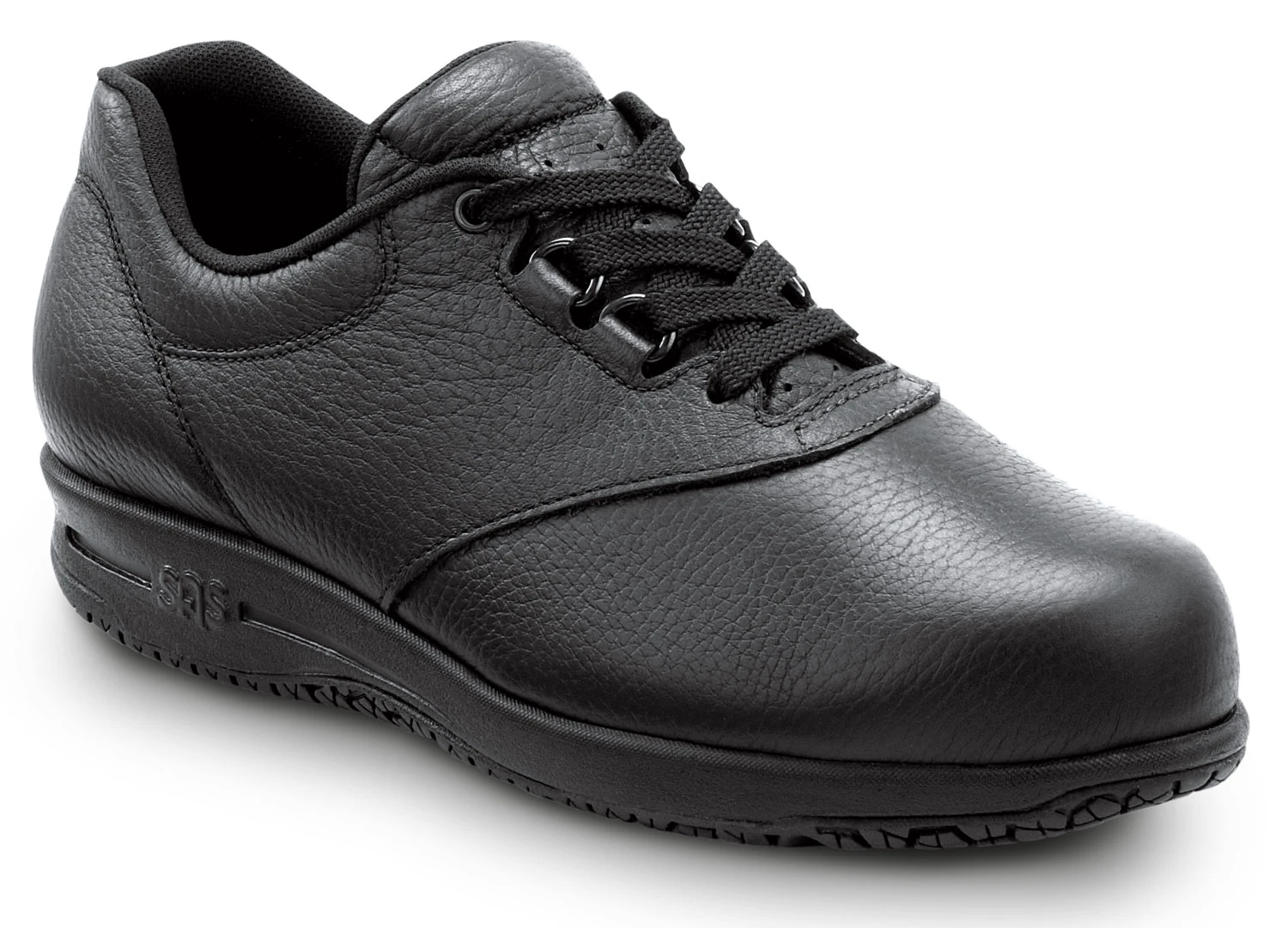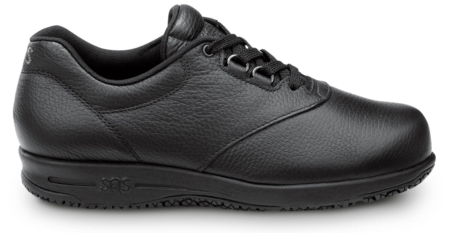 SAS Waterguard leather is water resistant. SAS Cool Step footbed with anti friction cover. TRIPAD cushioning at the inside ball, outside ball, and heel areas. Lightweight, flexible PU midsole. SAS X-Tra Grip slip resistant rubber outsole. Soft toe. No safety toe cap.