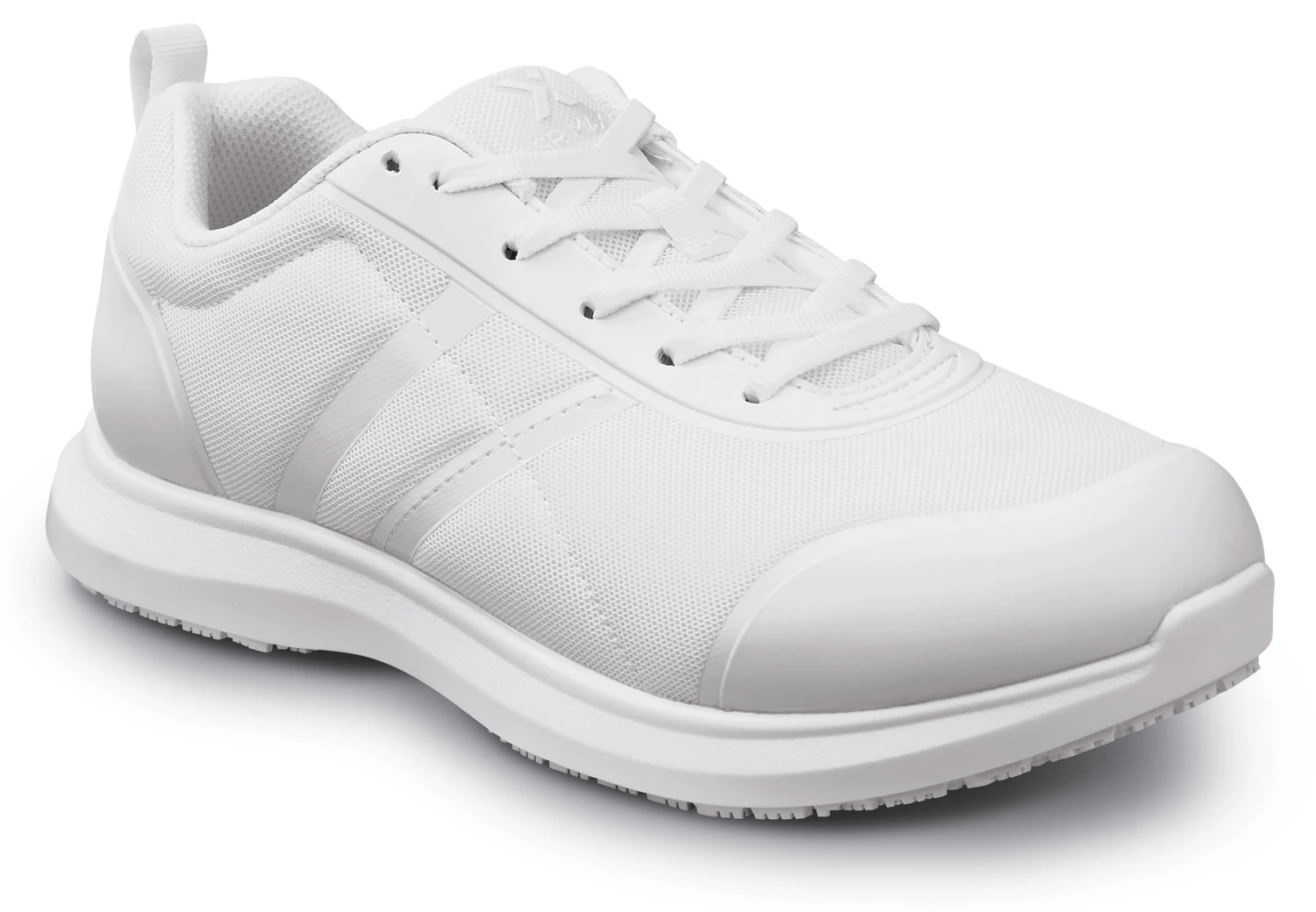 Mesh and TPU upper. DryKick splash-resistant membrane in toe area protects against food and liquid spills in the workplace. Mesh lining. PU and memory foam footbed. PU midsole. SR Max patented MaxTRAX oil and slip-resistant rubber outsole.Soft toe. No safety toe cap.