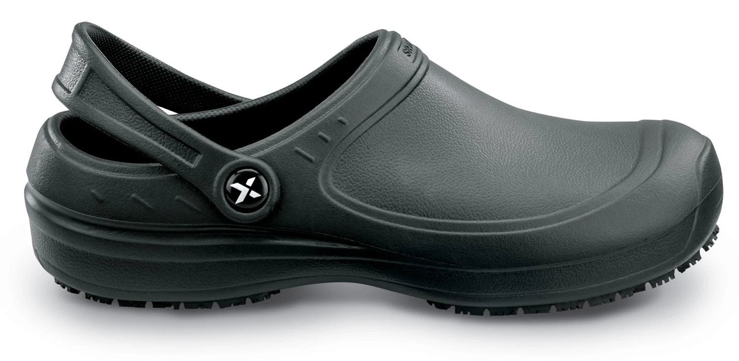 100% molded EVA upper with gunmetal silver rivets. Adjustable heel strap. PU cushion footbed. EVA midsole. Oil and slip resistant SR Max MaxTRAX patented rubber outsole. Soft toe. No safety toe cap.