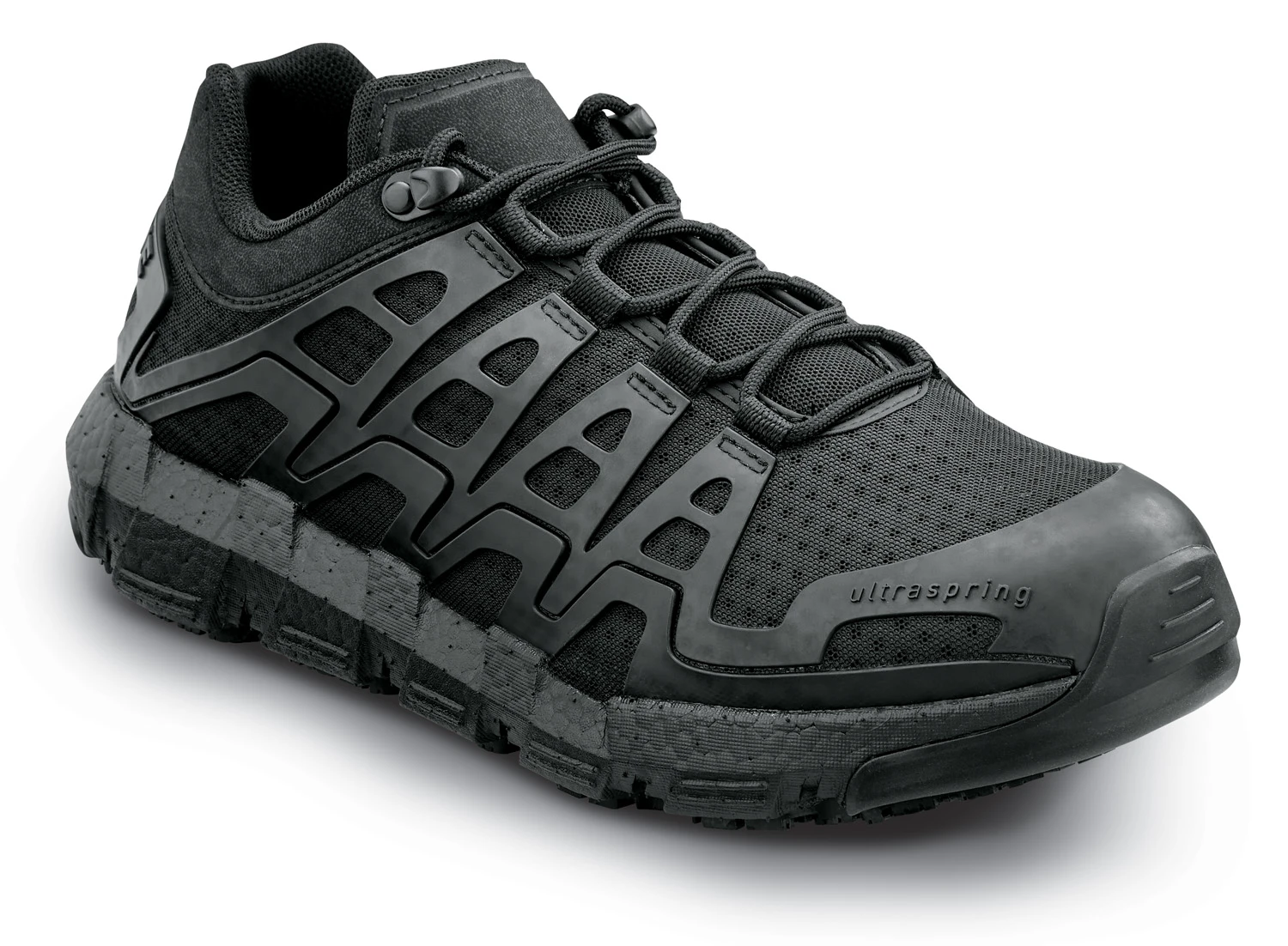 Breathable mesh upper with molded TPU reinforcements. Moisture wicking mesh lining. Removable, full cushion, low density PU footbed. UltraSpring high rebound ETPU cushioned midsole. Oil and slip resistant SR Max MaxTRAX patented rubber outsole. CarbonMAX comp toe. EH. ASTM F2413-18 M/ I/ C EH compliant.