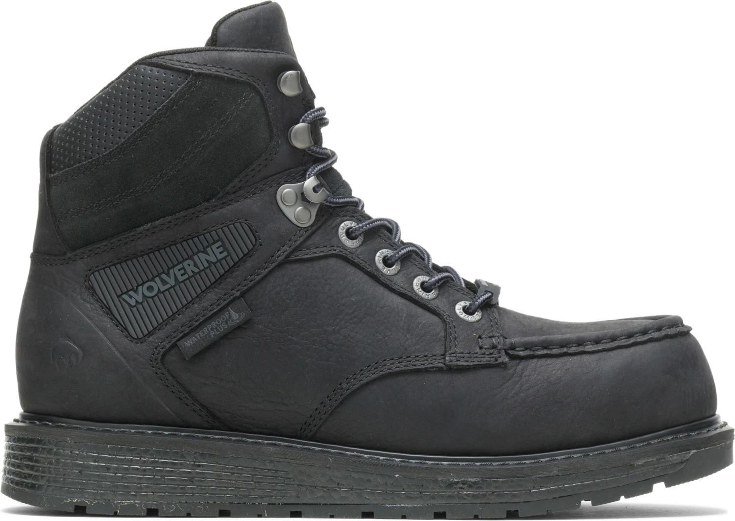 Waterproof full grain upper leather. Moisture wicking mesh lining with breathable, waterproof membrane. Removable Ortholite Ultralite cushioned footbed. High rebound ETPU UltraSpring wedge midsole. Slip resistant rubber lug outsole. Goodyear welt construction. Wolverine CarbonMAX nanotechnology safety toe. EH. WP. ASTM F2413-18 M/ I/ C EH compliant. 30 day comfort guarantee.
